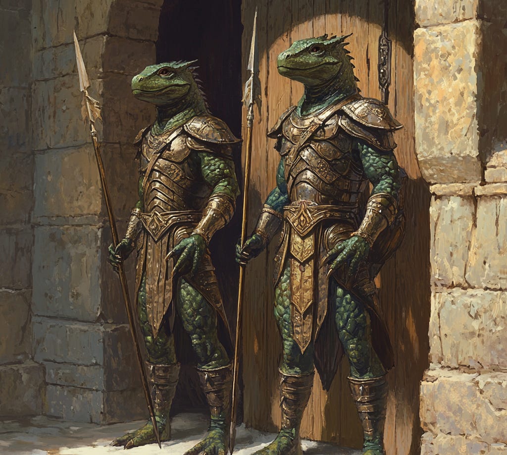 She came to a pair of guards. Both were korriks: a short, stocky race, with reptilian features and scaly hide instead of skin. Their clawed hands and martial spirit made them a natural choice for militaries across the world.