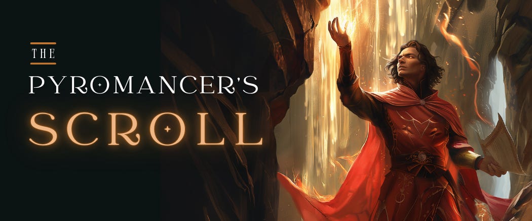 Glass showered down from the ceiling. A fireball came a moment later, engulfing the rear door in flames moments before the king reached it. Last came the pyromancer. Fifty feet he dropped, plummeting from his perch on the broken window sill, scarlet cloak billowing in his wake. Midway through his descent, he twisted in midair, fire erupting from his outstretched hands to slow his fall. He landed in a crouch before the main throne room doors.